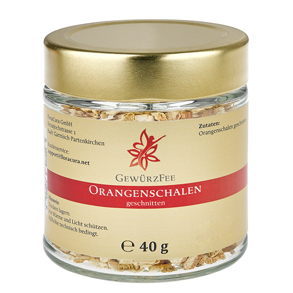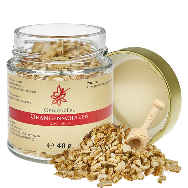 Ursprünglich stammen Orangenschalen aus Italien. Die Schalen sind stark aromatisch, riechen angenehm süsslich und schmecken bitter. Orangenschalen harmonieren besonders gut mit Koriander, Mohn, Thymian und Zwiebeln.